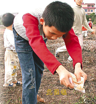 一名村童向蟻巢投放藥餌。(本報吳川傳真)