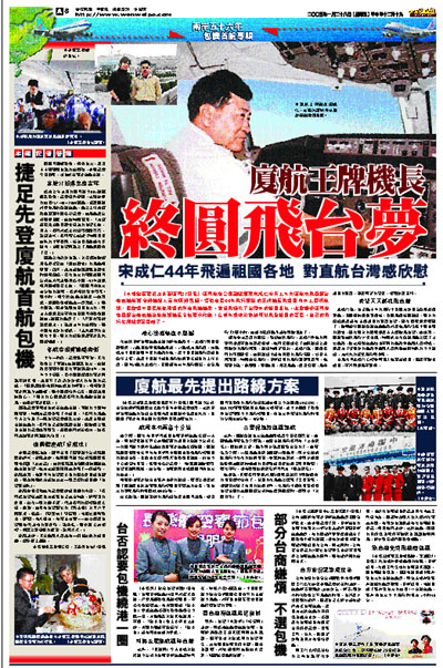 宋成仁說,自己幾十年的飛行中曾經為多國元首駕駛過專機、曾經參加過救災運輸、曾經飛過各類航線,最大的遺憾就是沒有去過祖國的寶島台灣,現在願望就要實現了,能夠擔任廈航首航包機機長將是他飛行生涯中最光榮的歷史,現在最大的願望就是天天都能飛台灣。據透露,廈航對這次飛行非常重視,特別決定在首航飛機上配了三名機長,除此每架包機均由不同的機長和機組人員構成,就是為了讓更多的機長和機組人員熟悉這條特殊的空中航線,為將來的正常飛行做準備。