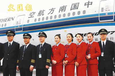 擔當首航任務的南航航班的機組人員27日亮相廣州新機場停機坪。(米南 攝)