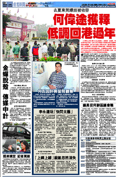 【本報珠三角新聞中心記者羅愛文、鄭海龍、趙鵬飛、陳光宗深圳28日電】去年七月在東莞虎門鎮嫖妓的民主黨觀塘區議員何偉途,於八月中被判入收容所半年,服刑約五個半月後,提早獲釋,今日回到了香港度春節。儘管香港方面民主黨大張旗鼓地召開新聞發布會,李華明還故布疑陣,直到下午五時左右還在說何偉途由於塞車而未過關進入香港。但事實上何偉途早在中午已在東莞悄然出監回港。