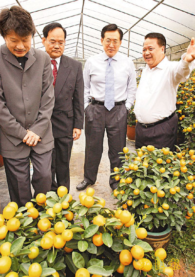 周一嶽及黃容根等人到大埔強記花園視察年桔情況。 (李志樑 攝)