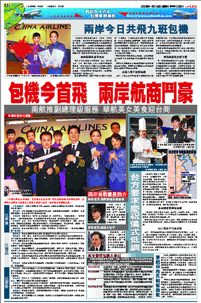 【本報訊】綜合中時晚報、中央社、台灣經濟日報、中新社28日消息:對於明天首航,相對大陸各航空公司以兩岸中斷56年民航直航為訴求,且大肆宣傳,台灣當局卻為避免被誤導包機為兩岸直航,主管機關「陸委會」已要求各航空代辦大陸民航機首航抵台的慶祝儀式也要低調些,一切從簡,就連新聞採訪也要求要低度採訪,對媒體還採自然區隔,並希望大陸航空代表只派一位接受採訪,並不得有政治話題,要以商業談話為限。