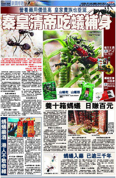 【本報駐廣西記者馬順、丁寧南寧28日電】中國食用和藥用螞蟻已有3,000多年的歷史。最早有文獻記載的是《周禮.天官》和《禮記.內則》曰:「蚳醢以供天子饋食」,蚳醢即是專門為周朝以前的首領採集螞蟻的幼蟲和蛹加桂皮,薑末等調料所製的醬進補。明朝偉大的醫學家李時珍在他的巨著《本草綱目》載:「蟻,釋名玄駒,亦作駒。蚍蜉,蟻有君臣之義,故字從義,亦作蚌。大者為蚍蜉,亦曰螞蟻……。其卵名蚳,山人掘之,有至斗石者。古人食之,故內則周官饋食之豆有蚳醢也……。」