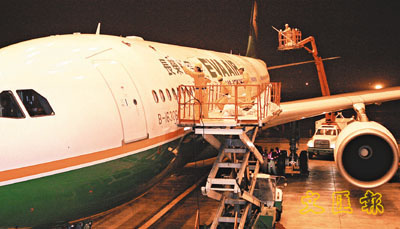 工作人員正在為有份參與春節包機的台灣長榮航空的飛機進行清潔,為今天的包機直航作最後準備。 (中央社)