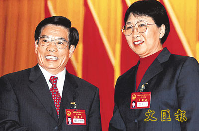 原廣東省人大常委會主任盧鍾鶴(左)祝賀黃麗滿當選。 (中新社)