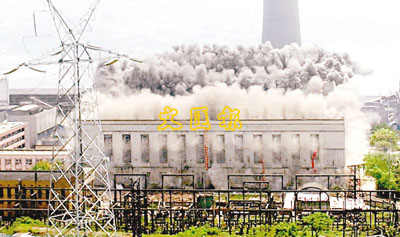 重慶發電廠東廠不符合環保要求,圖為該發電機組在定向爆破聲中炸塌,將重建環保脫硫型機組,確保二氧化硫和粉塵排放符合國家環保的要求。(新華社)