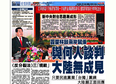 賈慶林今日具體闡述了大陸對待民進黨的態度,他表示,大陸認為廣大民進黨員與「台獨」分子是有區別的,歡迎民進黨員以適當身份來大陸訪問。他還強調,只要民進黨放棄「台獨黨綱」,停止「台獨」分裂活動,大陸願意作出正面回應,並與之接觸交往。