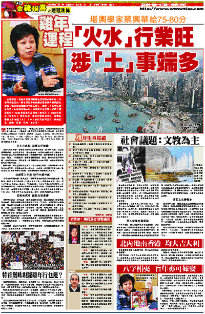 金雞報喜,香港市民送別經濟持續復甦的猴年後,好景可望繼續來。著名堪輿學家兼曆法專家蔡興華樂觀地預測,雞年香港經濟將平穩地更上一層樓,失業率持續有改善;社會戾氣雖未散,但情況已有好轉,總算「國泰民安」。她並形容雞年是香港「耕耘年」,2006年便是「豐收年」。雞年地產、股票市道雖有增長,但速度緩慢;所有屬「火」、「水」的行業會較昌旺,例如零售、旅遊、運輸、保險、設計等。
