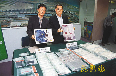 【本報訊】年近歲晚,海關加強搜查旅客,防止毒販趁人流多偷運毒品出境,成功破獲兩宗毒品案。其中一名侍應貪圖兩萬元報酬,以繃帶將冰毒纏在大腿,圖經機場偷運往澳洲被捕。另外海關在土瓜灣拘捕一對「毒鴛鴦」,起出大麻及「霹靂」可卡因,連同機場檢獲的冰毒共值65萬元。