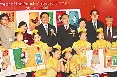 香港郵政昨日發行一套共4款面額介乎1.4至5元的農曆新年「歲次乙酉(雞年)」特別郵票,並在郵政總局舉行發行儀式,由香港郵政署長蔣任宏及財經事務及庫務局局長馬時亨主持。