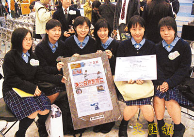聖士提反女子中學六名學生展示報刊組冠軍作品。 (任智鵬 攝)