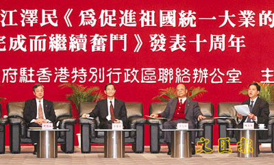 【本報訊】(記者 莊海源、邱萍菲)中央政府駐港聯絡辦昨在港舉辦香港各界紀念江澤民《為促進祖國統一大業的完成而繼續奮鬥》發表十周年座談會,中聯辦副主任黎桂康在會上發表《攜手奮進,共創祖國完全統一美好前景》的重要講話。全國人大常委曾憲梓,特區政制事務局局長林瑞麟,部分港區全國人大代表,全國政協常委、委員,香港工商、政團、新聞、文體、教科、法律界以及居港台胞和中資企業的負責人等,共約60人參加座談會,暢談中央對台方針政策、兩岸關係現狀,並就如何促進祖國統一建言獻策。