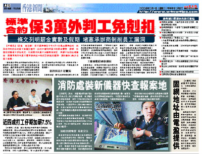 【本報訊】(記者 施立偉)勞工處準備在今年4月1日推出標準合約,給政府外判的合約員工簽署及遵守。合約中會列明員工的薪金實數、假期、在固定的區域工作等條文,以保障外判員工如護衛和保安、清潔工等的合理權益,阻塞現時外判員工遭承辦商從中剋扣及剝削的漏洞,預計會有3萬多名員工受惠。