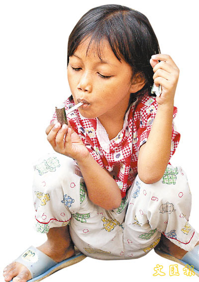 小煙民——其實小女孩手中的只是乾冰做的小玩具。