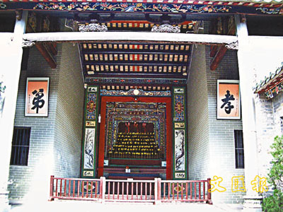 跟著文物徑沿線的指示,步行數分鐘便看見兩座外形十分相近的建築物,左邊的就是鄧氏宗祠。它是三進兩院式的恢宏建築,為香港同類古建築之佼佼者,其最大特色是宗祠正門沒有門檻,前院卻有砂岩甬道,顯示鄧氏族人中曾有身居當時朝廷要職。筆者尤其喜愛三進大廳上那刻有精美動植物圖案的樑架雕刻,而屋脊上的石灣鰲魚和麒麟更令人驚嘆!