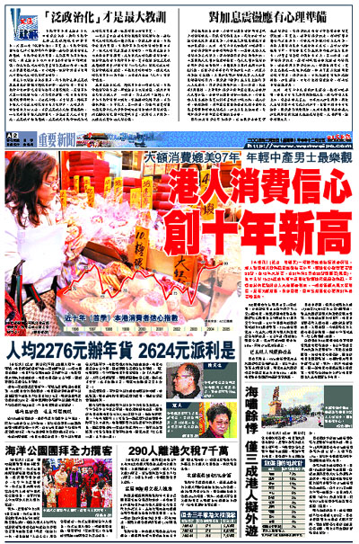 AC尼爾森在上個月10至14日期間,以電話訪問1016位年齡介乎15至54歲市民,結果發現市民對香港經濟信心指數由去年同期的97點升至今年99點,比97年回歸初期經濟高峰期的98點還要高。25%被訪者認為,在未來12個月內個人財政狀況會有所改善,比去年第4季增加5個百分點,認為可維持現狀亦有63%,只有12%認為會變差。
