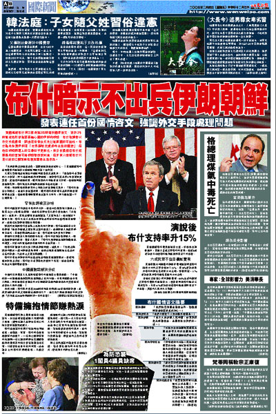 美國總統布什周三發表第2任期首份國情咨文,對於3年前曾被他形容為邪惡軸心國的伊朗和朝鮮,布什強調會以外交手段處理,間接否定會出兵攻打這兩國的可能性。布什點名指責伊朗是「世界頭號支援恐怖主義的國家」,但他在朝鮮問題上的立場似乎更軟化。有分析員相信布什扼要溫和的言論可將朝鮮帶回談判桌,但亦有人懷疑布什只是以新的公關策略包裝其單邊主義本色。