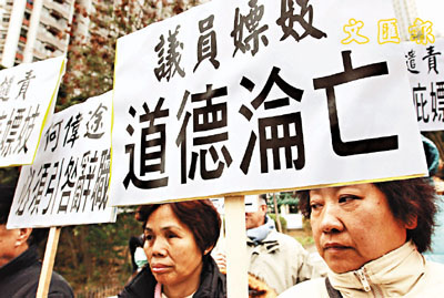 何偉途嫖妓事件關注組在聖母醫院門外抗議,要求何偉途辭職。 (李志樑 攝)