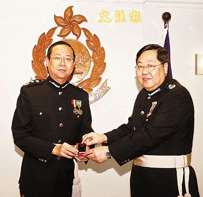 入境處115名入境事務隊人員昨日獲處長黎棟國頒授長期服務獎章及加敘勳扣。頒授儀式在入境事務處總部舉行。圖為黎棟國頒發香港入境事務長期服務獎章—加敘三條勳扣予助理處長(管理及支援)蔡炳麟(圖右),以表揚他竭誠奉公,為部門服務33年。