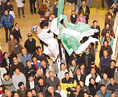 新春將至,揚威國際的「廣州雜技團」來港獻技 ,由昨天起至本月20日,市民可以在太古城中心一睹「雜技團」的非凡絕藝,包括「鞦韆頂技」、「空中體操」、「高空綢吊」及「足尖空竹」等多項神乎奇技的表演。「雜技團」每日演出3場,分別為下午1:30、3:30及晚上7:30,而於2月8日晚上9:30及2月16日中午12:00在2樓舞台,更有舞龍舞獅表演。(張立新攝)