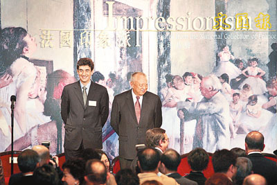 行政長官董建華和法國駐港總領事孟嗣德(左)站在《舞蹈課》巨型海報前等候儀式開始。 (潘達文 攝)