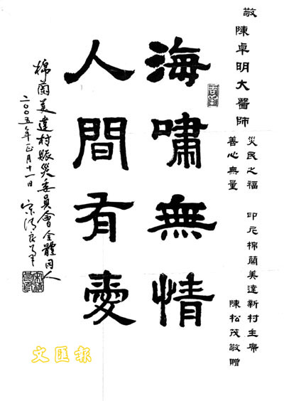 為了感謝陳卓明中醫師父子的人道義舉,棉蘭美達村主席陳松茂代表美達村賑災委員會向陳醫師贈送了感謝狀,上書「海嘯無情,人間有愛」(見圖)。