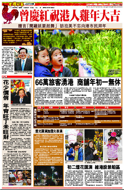 【本報訊】國家副主席曾慶紅結束拉丁美洲五國訪問,清晨離開牙買加前,他再次向行政長官、特區政府及香港市民問好,又提早向港人拜年,祝願港人新春愉快:「問特首好,問特區政府好,問廣大香港同胞好,拜早年了,新春愉快,雞年大吉,恭喜發財。」