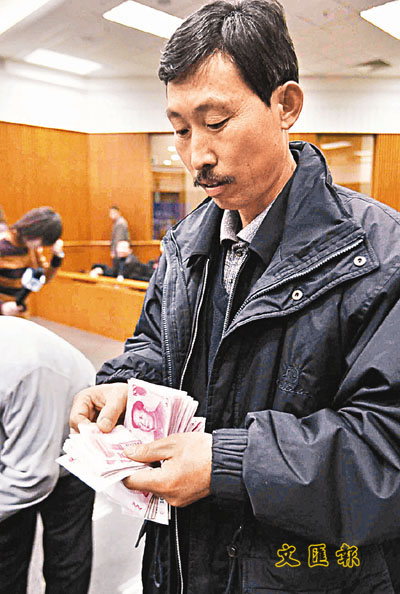 據勞動與社會保障部部長鄭斯林透露,內地正在試點欠薪長效保障機制,隨後將在全國推廣。圖為一北京民工追回被拖欠長達6年的工資。(資料圖片)