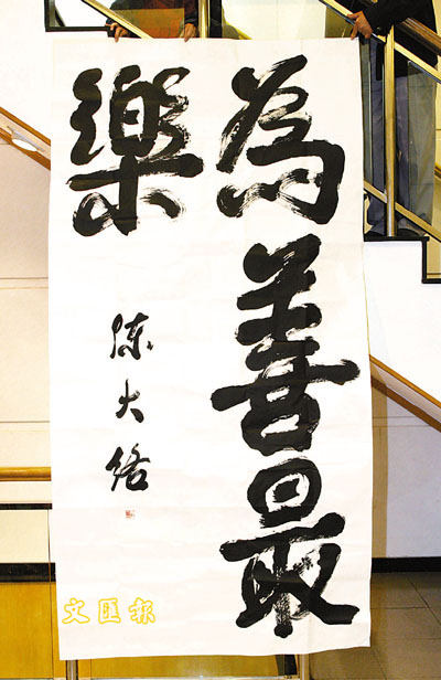 本報日前收到台灣著名書法家陳大絡寄來巨幅書作(見圖),並附短函稱在本報公開拍賣,所收善款悉捐南亞地震海嘯災區賑災,並各善長仁翁慷慨解囊。