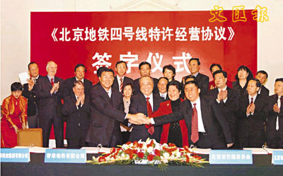 【本報北京新聞中心記者李雪穎7日電】香港地鐵公司(0066)今日在此間聯同首創置業(2868)母公司北京首創集團以及北京市基礎設施投資公司,與北京市政府草簽北京地鐵四號線項目《特許經營協議》,為期30年,該協議經國家發改委正式批准後即可落實。