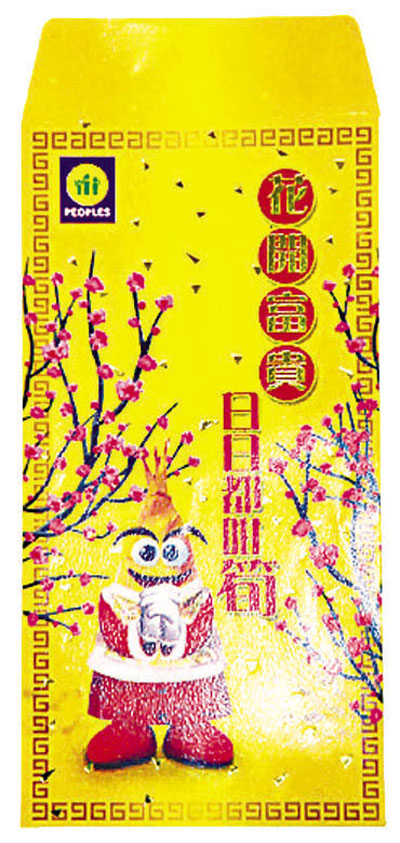 相比起來,向來創意無限的電訊商就被比了下去。好似電盈咁,仍然是兩個穿中國服飾既小孩燒炮仗,配上《富貴平安》的祝福。和記的3香港都係去年的紅底金字《3陽啟泰》。不過最令人失望的,還是香港寬頻,老闆王維基向來夠搞鬼,最多標奇立異的好玩意念。今次反而傳統起來,金底金字的《如意吉祥》,中間配紅底雞酉字畫交差算數。反而中資背景的華潤萬眾,就用了揮春紙質造利是封,封包面上一個筍頭公仔,合十雙手恭祝大家日日都咁筍。