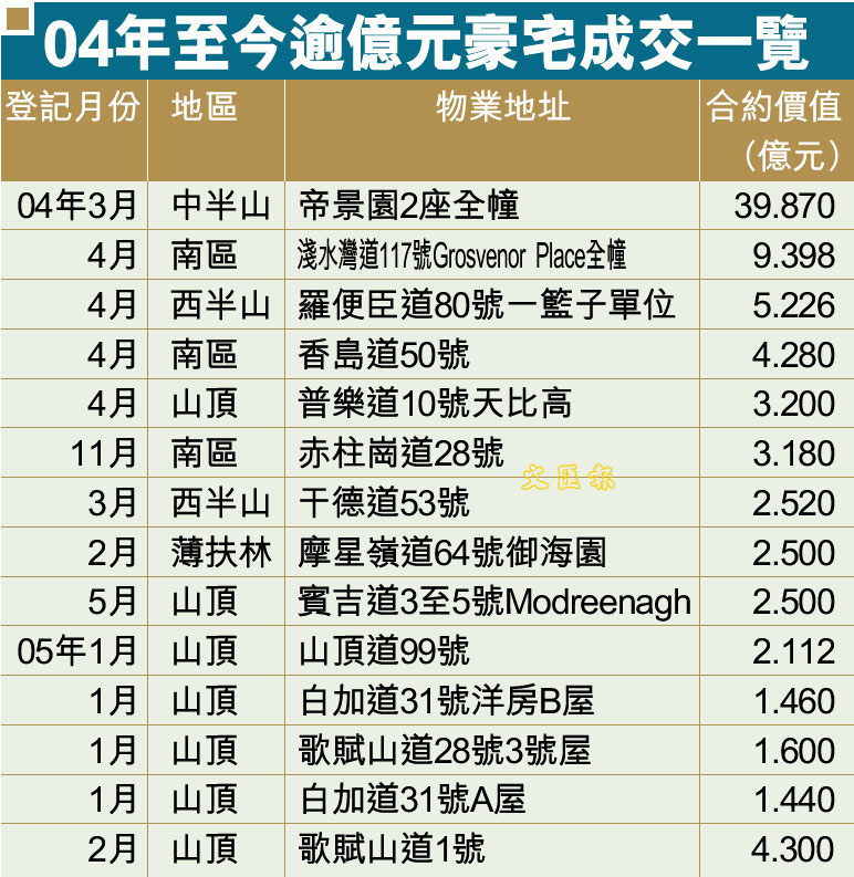 04年至今逾億元豪宅成交一覽 (圖)