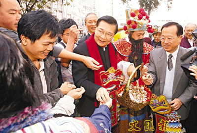 譚耀宗與陳鑑林等與財神一起向市民拜年,並大派發財金蛋。 (劉國權 攝)