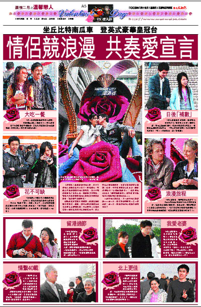 「我們打算返廣州過節,那裡的氣氛比這裡還要濃!」張先生說內地年輕人愈來愈重視西方情人節,內地濃情蜜意的氣氛與香港不相伯仲,甚至有過之而無不及。「吃晚飯就免了,太多人了,不過送花的指定動作當然就不可少!」