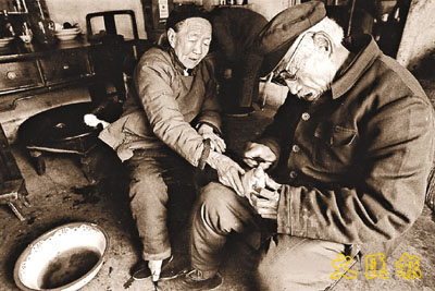 焦波攝影作品《俺爹俺娘》娘6歲纏腳,趾甲長成了蝸牛的樣子,爹常為她修剪。(1994年)