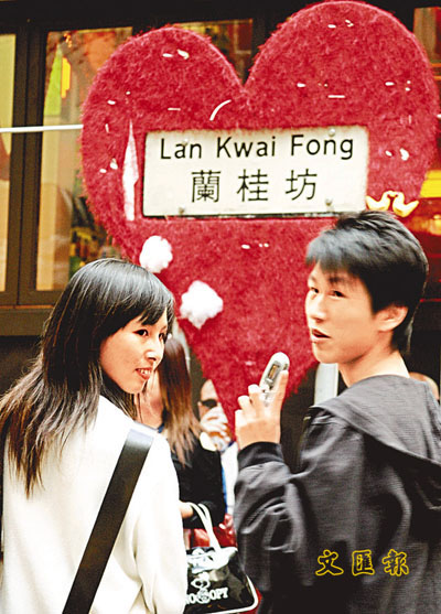金童玉女登場:蘭桂坊到處都被愛意包圍,充滿著情人節的氣氛。(羅蘭蓉 攝)