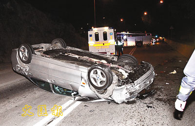 失事私家車撞壆後翻轉,四輪朝天橫亙路上。