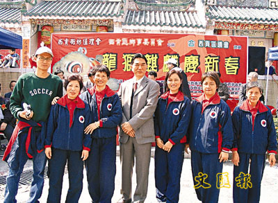 李福康與太極劍的表演者合照,對她們的精彩武術表演極表讚賞。(沈清麗 攝)
