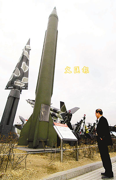 在漢城展出的韓國(左)和朝鮮導彈模型。(路透社)