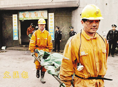 近年內地煤礦事故頻頻發生,造成不少傷亡。圖為河南大平煤礦2004年10月20日發生瓦斯爆炸後,救護人員把遇難者遺體抬出礦井。 (資料圖片)