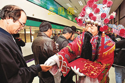 恭喜發財——打工仔都希望財源廣進,而香港郵政發行雞年郵票時,更安排財神向市民派「利時糖 」。(趙焜崗 攝)