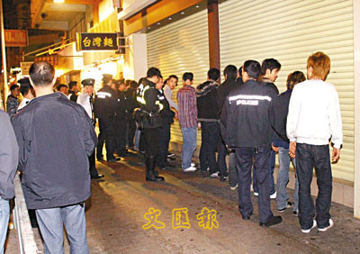 現場消息稱,元朗一名黑幫「大佬」,最近疑為爭女人問題與同門反目,昨凌晨零時,召來29名門生,在元朗教育路49號中旅社對開集結,擬到教育路一間電子遊戲機店舖,找情敵算帳,此時,一名休班警長路過,目睹大批大漢在街頭叫囂,並手中持有武器,恐發生武鬥,連忙致電通知同袍到場制止。