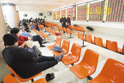 滬深股市昨日開出紅盤。圖為在上海一個證券行內,幾名女股民正輕鬆地一邊織毛衣,一邊看著指示板上幾乎全線飄紅的股價。 (法新社 )