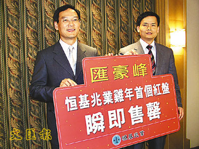 恆基謝偉銓(左)宣布匯豪峰雞年開紅盤,旁為林達民。 (周穎 攝)