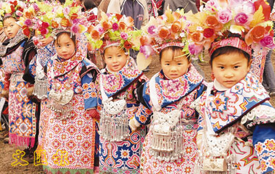 17日,苗家小姑娘們身著盛裝,參加貴州省貴陽市花溪區燕樓鄉等地的苗族同胞一年一度的「跳花節」。(新華社)