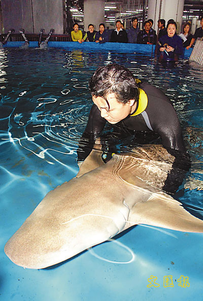 17日,北京海洋館的鯊魚馴養員在對一條剛剛搬入鯊魚暫養池的護士鯊進行助游訓練。 (中新社)