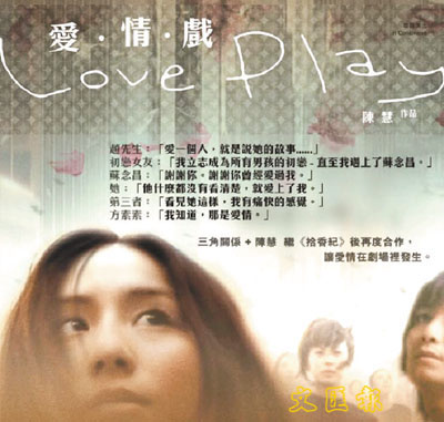 從等待開始,至痛苦結束,配合細膩的文字和悅目的舞台視覺,這是蘇念昌與方素素的愛情故事,「三角關係」劇團將以陳慧度身創作的文本,轉化成即將上演的劇場版《愛情戲》,敘述愛情的激烈與憂傷。