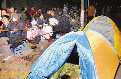 中國美術學院招生專業考試報名於21日正式啟動,據悉今年計劃本科招生 1,580名。20日晚至21日晨,來此排隊的考生人數超過1萬人,一些考生還將帳篷帶來「安營紮寨」。(新華社)