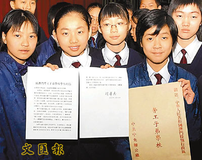 21日,在澳門勞工子弟學校開學典禮上,莊青青(左二)等同學展示胡錦濤主席的回信。(新華社)