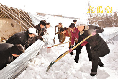 新疆上周落下幾十年來最大的降雪,當地村民前天忙於清除溫室頂部的積雪。﹙新華社﹚
